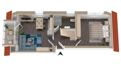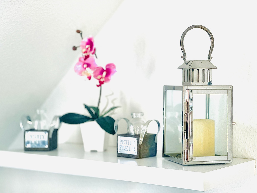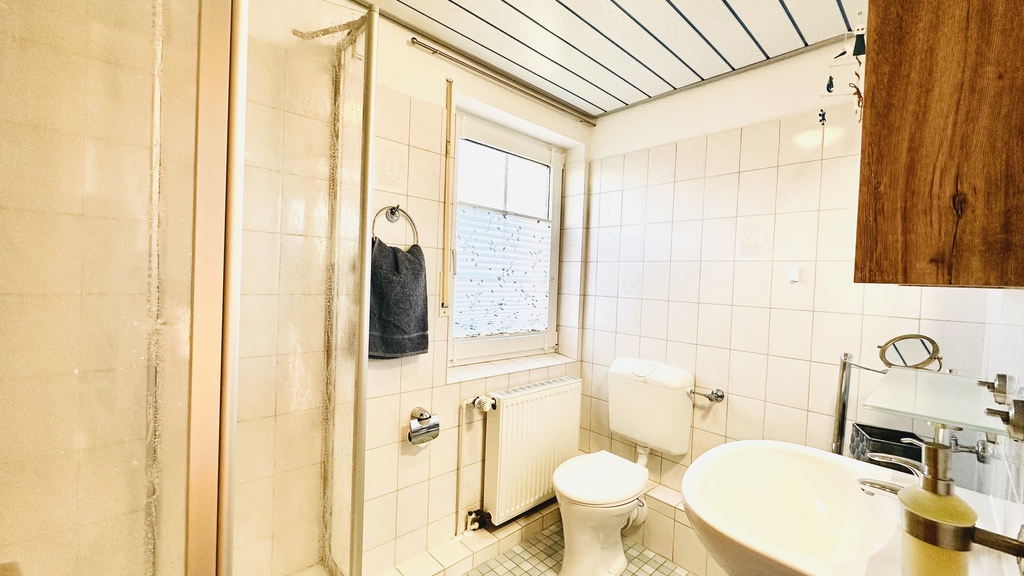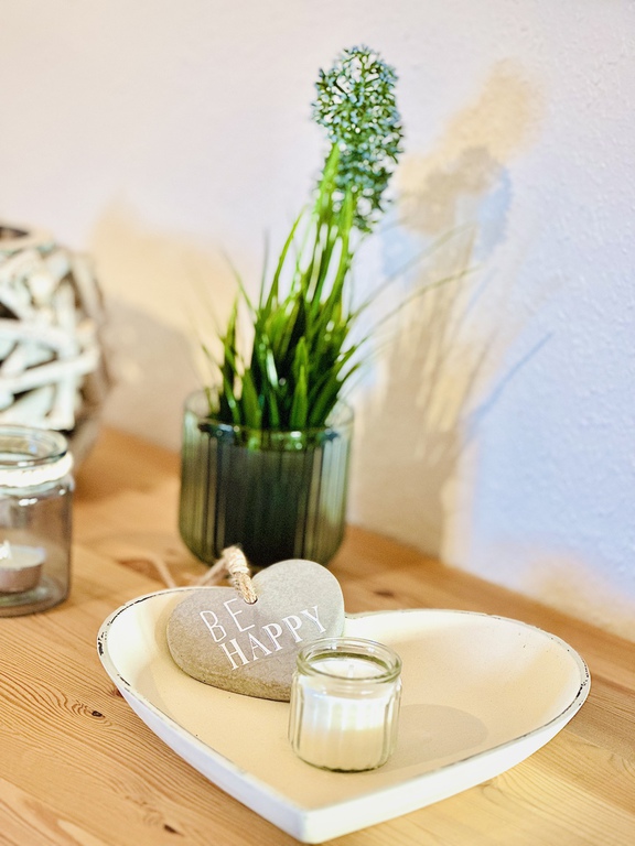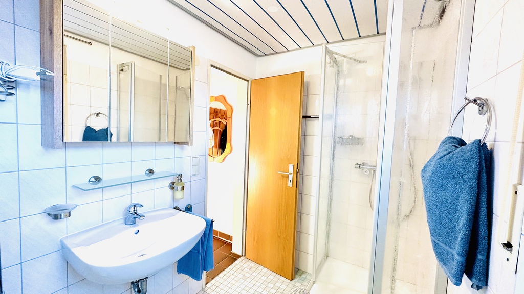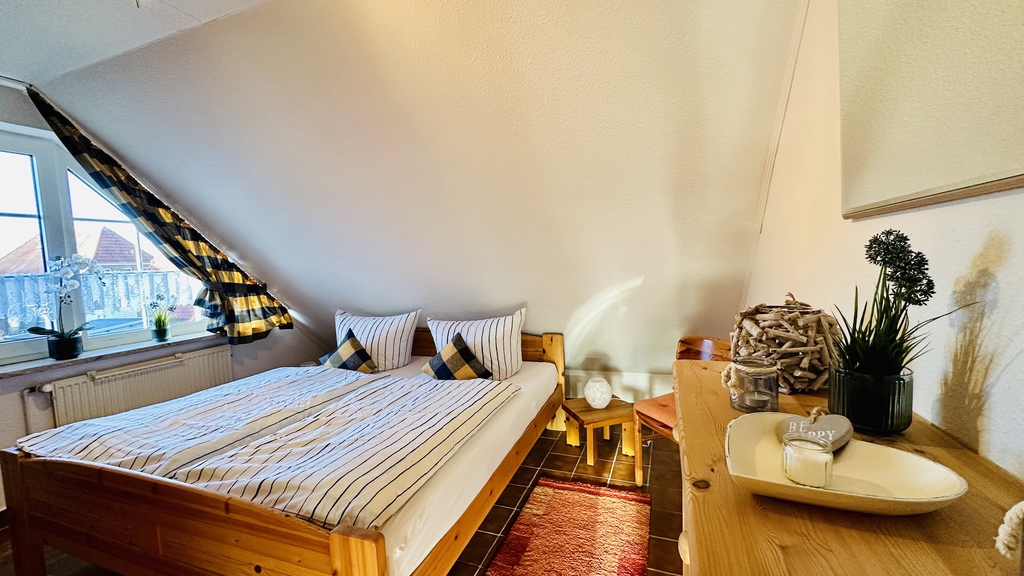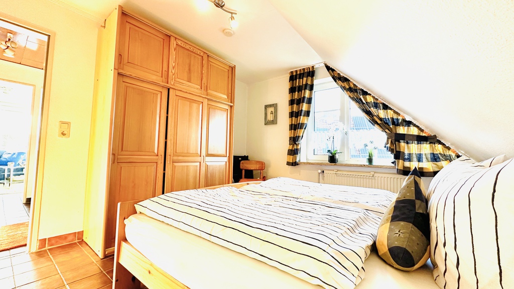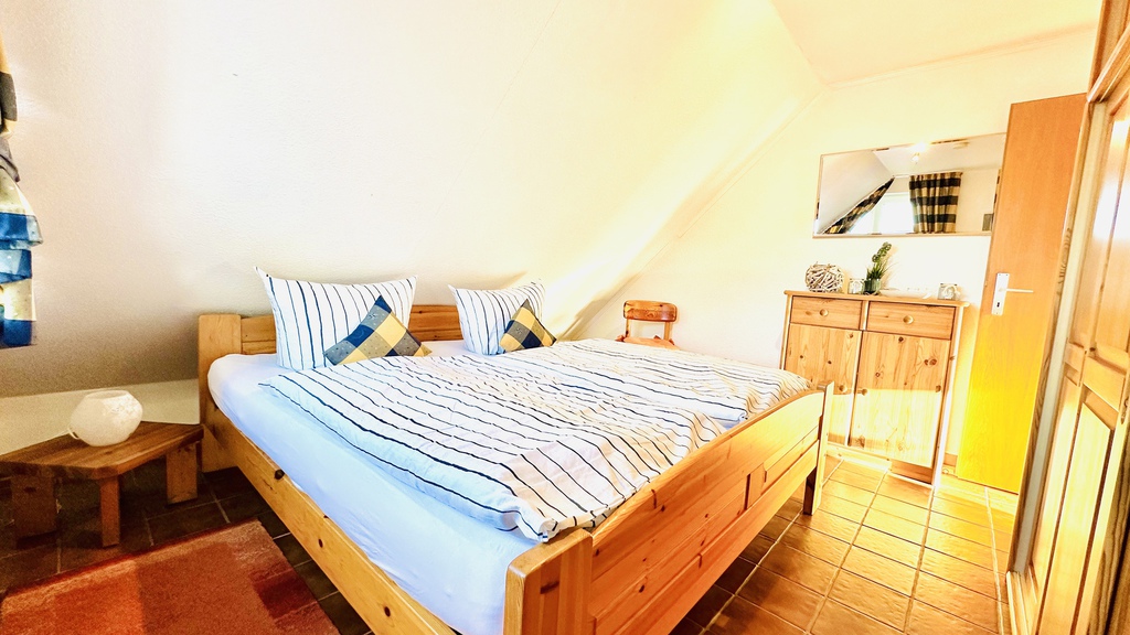 Aufgeteilt ist die Ferienwohnung in 1 Schlafzimmer mit Doppelbett und großem Schrank. Das helle Badezimmer ist modern ausgestattet mit einer Dusche, Handwaschbecken und Toilette.