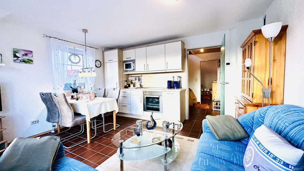 Der offene Wohn- und Essbereich ist mit einer gemütlichen Couch, einem Essbereich und der Küche eingerichtet.